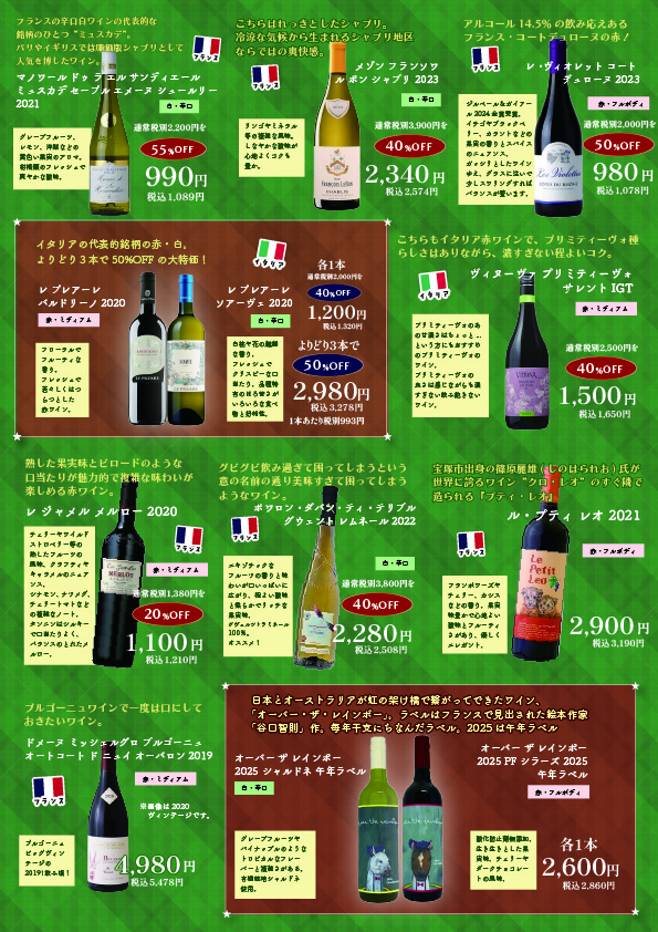 2025 年 12 月 10 日公開 12月12日(金)~12月21日(日) ワインフェア開催! #特売情報 #お知らせ ▲画像をクリックで拡大表示でご覧いただけます♪▲✨本年最後のワインフェア開催✨12/12(金)〜12/21(日)期間中、ワインは、全品チラシ掲載品もさらに10%OFF!クリスマスに向けてもおすすめの、★ シャンパン★ スパークリング★ 赤・白ワインお買い得商品を多数ご用意しています。ご自宅用にも、贈り物にもおすすめです!この機会にぜひお立ち寄りください。※西宮北口2号店「酒 style-AzumaZuru」は対象外※品切れの際はご容赦ください